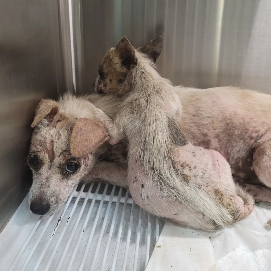 장마비가 세차게 내리던 여름날, 길 위에 온 몸이 피부병으로 덮혀있는 모녀 강아지가 있었어요. 비가 그치면 폭염으로 뜨겁게 데워진 길 위에서 잠을 청하던 아이들..